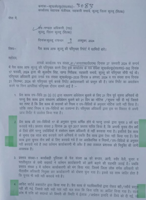 पंजीयक सहकारी सभाएं कुल्लू द्वारा करवाई गई जांच में साफ तौर पर प्रेस क्लब कुल्लू के तमाम गड़बड़ झालों व मनमानी का कच्चा चिट्ठा पेश किया है। जांच रिपोर्ट के मुताबिक साधारण अधिवेशन बुलाने के लिए 21 दिन पूर्व सूचना देना अनिवार्य था। लेकिन प्रेस क्लब कुल्लू द्वारा साधारण अधिवेशन बुलाने बारे किसी को 21 दिन का नोटिस या सूचना नहीं दी गई।