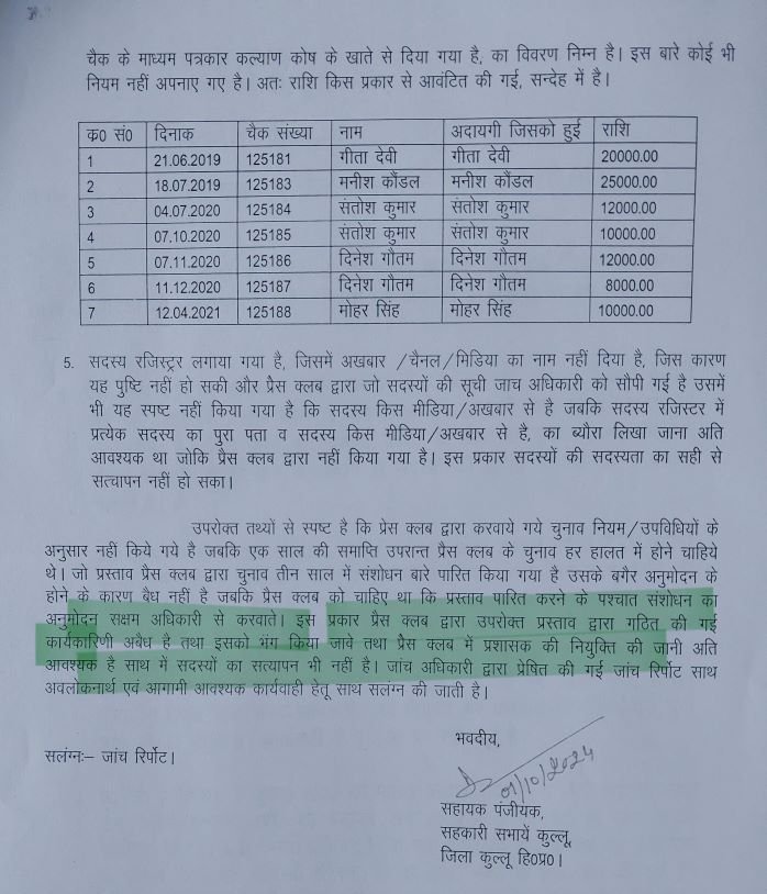 प्रेस क्लब ऑफ कुल्लू की कार्यकारिणी पूरी तरह से अवैध है। इसके चुनाव में संविधान के नियमों, उप नियमों का किसी भी तरह से पालन नहीं किया गया है। ऐसे में चुनाव और कार्यकारिणी पूरी तरह से नियमों के विपरीत असंवैधानिक है, जबकि प्रेस क्लब आफ कुल्लू द्वारा आय-व्यय संबंधी किसी भी प्रकार के दस्तावेज व सही जानकारी जांच अधिकारी को नहीं दी गई है। ऐसे में प्रेस क्लब कुल्लू में तत्काल प्रशासक की नियुक्ति की जानी चाहिए।