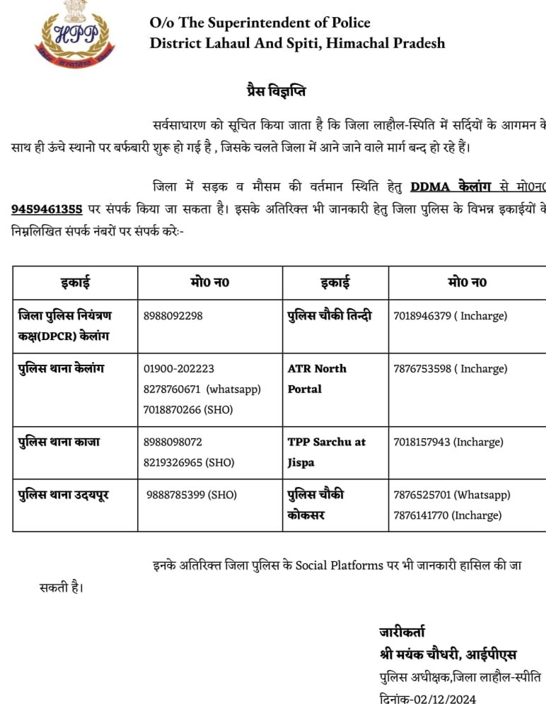 जिला लाहौल एवं स्पीति में बर्फबारी शुरू हो गई है। पुलिस अधीक्षक मयंक चौधरी ने आमजन को दिशा निर्देश दिए है कि सुरक्षित यात्रा करने हेतु सभी सलाह एवं परामर्श का पालन करें। जिला पुलिस पर्यटकों का जिला में पधारने पर स्वागत करती है।