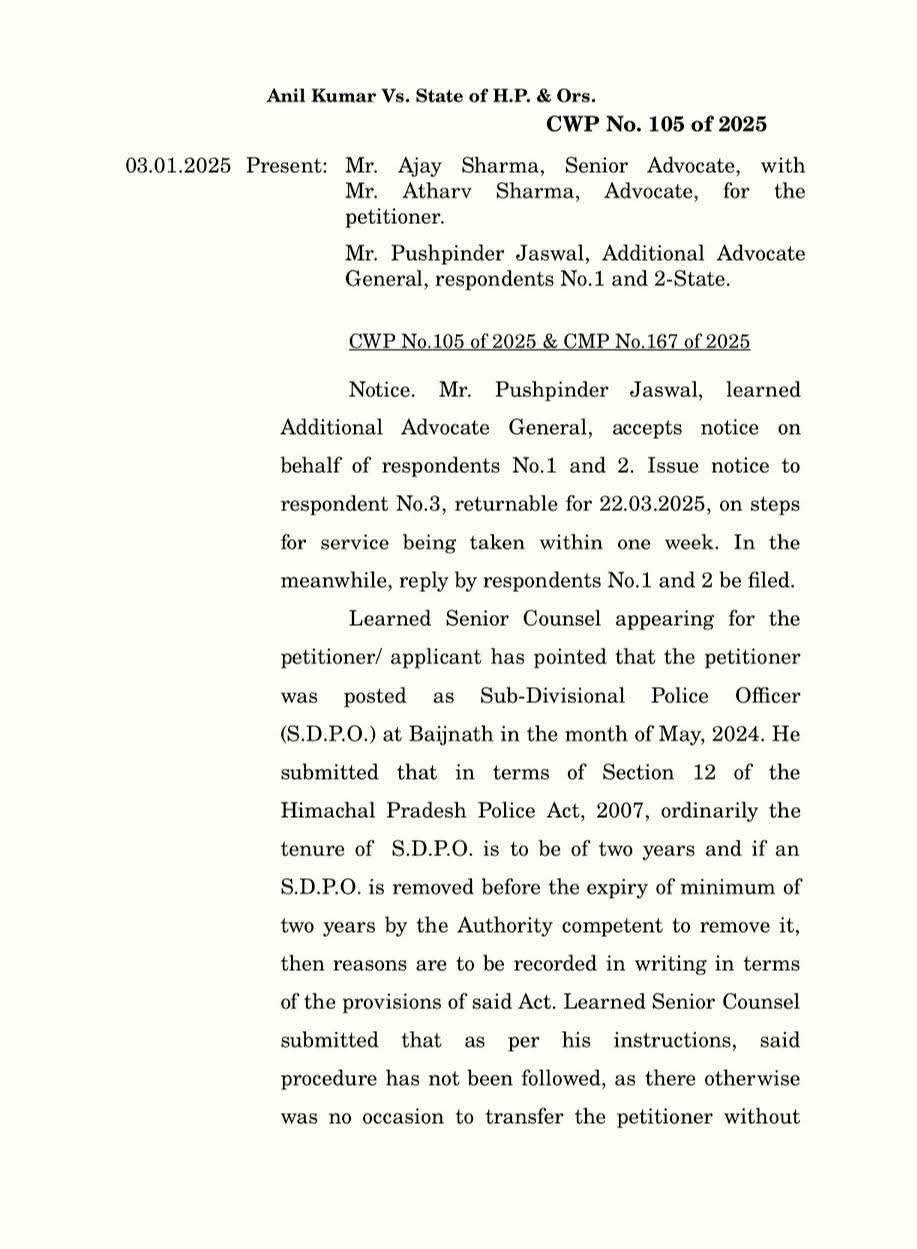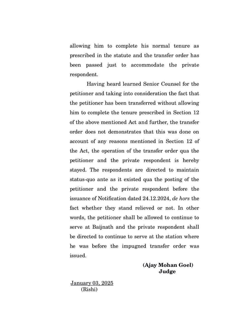 डी एस पी बैजनाथ अनिल शर्मा के तबादले पर उच्च न्यायालय की रोक लगा दी है। उनका तबादला गत दिनों 6 महीने के बाद ही बैजनाथ से पी टी सी डरोह कर दिया था। उच्च न्यायालय ने ताबदले पर रोक लगा दी है। अनिल शर्मा महज 22 वर्ष की आयु में डीएसपी बन गए थे।