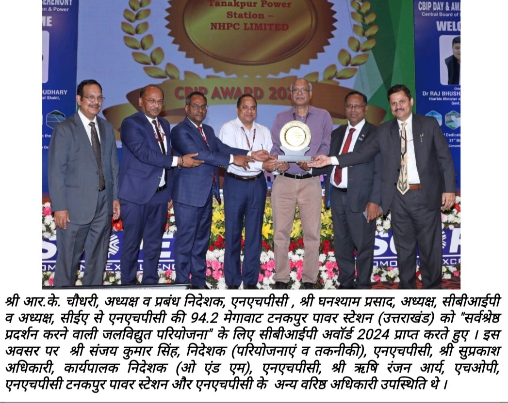 आर.के. चौधरी, अध्यक्ष व प्रबंध निदेशक, एनएचपीसी के साथ संजय कुमार सिंह, निदेशक (परियोजनाएं व तकनीकी) एनएचपीसी, सुप्रकाश अधिकारी, कार्यकारी निदेशक (ओएंडएम), एनएचपीसी , ऋषि रंजन आर्य, एचओपी, एनएचपीसी टनकपुर पावर स्टेशन और एनएचपीसी के अन्य वरिष्ठ अधिकारियों ने घनश्याम प्रसाद, अध्यक्ष, सीबीआईपी व अध्यक्ष, सीईए से यह पुरस्कार प्राप्त किया।