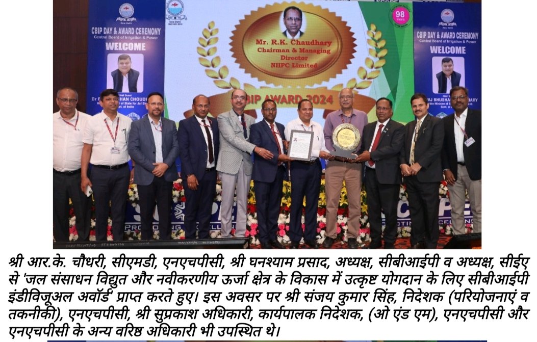 अध्यक्ष व प्रबंध निदेशक एनएचपीसी (भारत सरकार का एक नवरत्न उद्यम)आर.के. चौधरी, को जल संसाधन, विद्युत और नवीकरणीय ऊर्जा क्षेत्र के विकास में उत्कृष्ट योगदान देने के लिए प्रतिष्ठित ‘सीबीआईपी इंडीविजुअल अवॉर्ड’ से सम्मानित किया गया है।