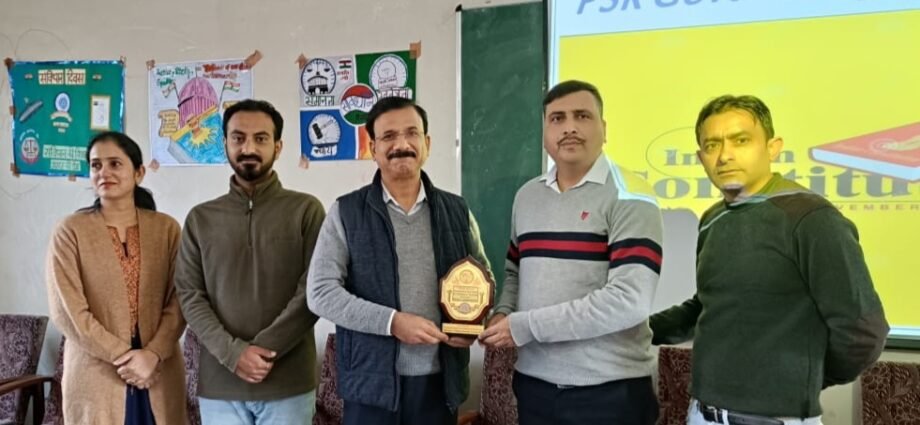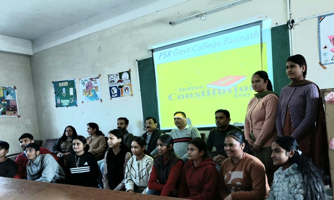 जिला कांगड़ा के पं. संतराम राजकीय महाविद्यालय बैजनाथ में संविधान दिवस के अवसर पर राजनीति शास्त्र विभाग ने एक विशेष कार्यक्रम आयोजित किया गया। कार्यक्रम समन्वयक डॉ. पवन कुमार सहायक आचार्य राजनीति शास्त्र ने सर्वप्रथम मुख्य अतिथि डॉक्टर प्रदीप कुमार कौंडल और अन्य अतिथियों का औपचारिक स्वागत किया अपने स्वागत भाषण में उन्होंने कहा कि संविधान केवल एक दस्तावेज नहीं, बल्कि राष्ट्र की आत्मा है, जिसे समझना और आत्मसात करना हर नागरिक का कर्तव्य है।