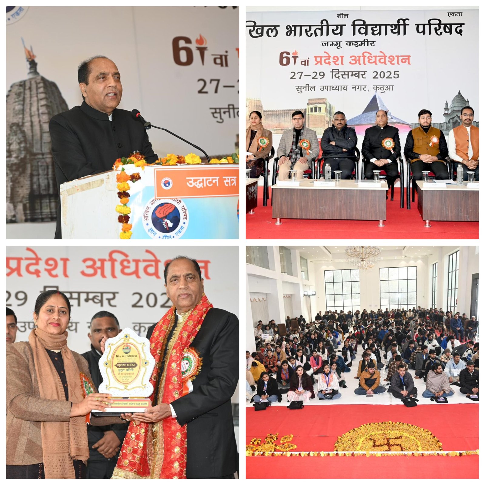 नेता प्रतिपक्ष एवं पूर्व मुख्यमंत्री जयराम ठाकुर ने कहा कि जम्मू कश्मीर के कठुआ जिला के सुनील उपाध्याय नगर में आयोजित अखिल भारतीय विद्यार्थी परिषद के जम्मू कश्मीर प्रांत के 61वें प्रदेश अधिवेशन में शामिल होकर गौरवान्वित महसूस कर रहा हूं।
